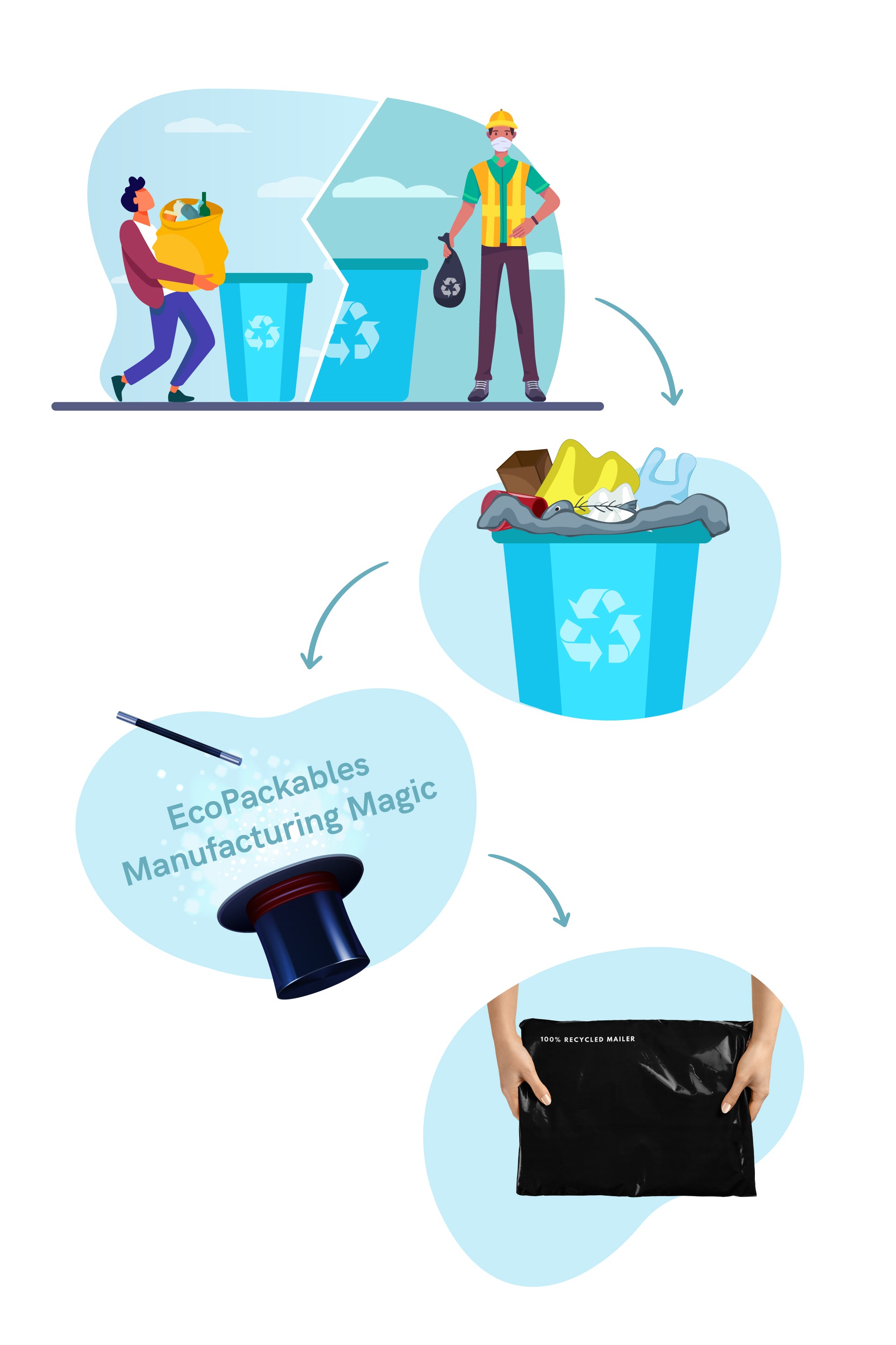 The sustainable apparel packaging ecosystem is comprised of three main materials: Recycled Plastic, Recycled Paper and Compostables. Most sustainable packaging companies focus on one, maybe two of these materials. Here at EcoPackables, we offer all three, understanding that they each have their pros and cons, and the only way these materials will improve is by increasing demand for sustainable packaging.